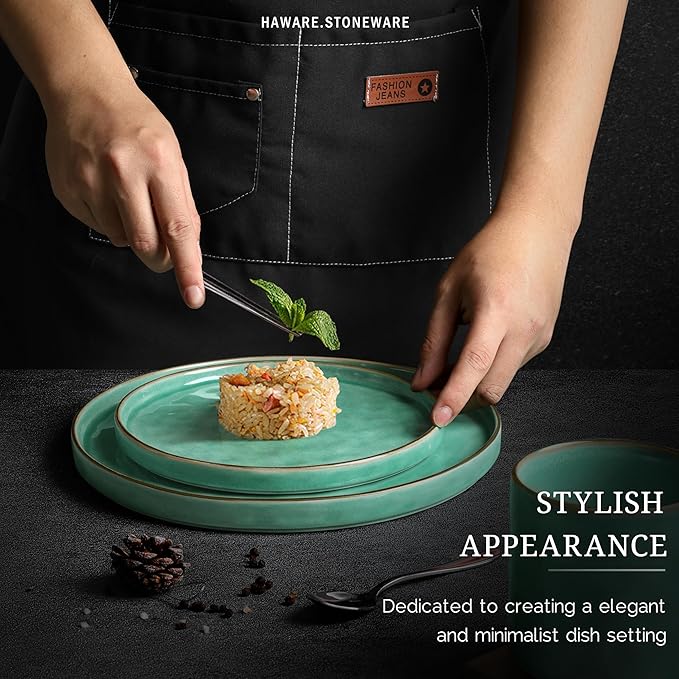 HaWare Dinnerware Sets, 16-Piece Stoneware Plates and Bowls Set, Elegant Ceramic Dish Set for 4, Chip and Scratch Resistant, Microwave and Dishwasher Safe, Reactive Green