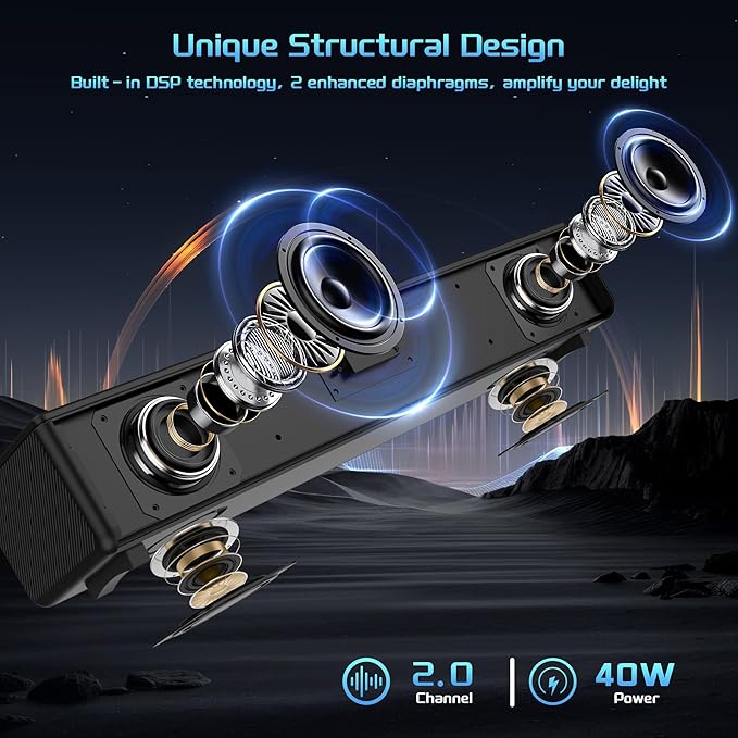 - Easy Setup and Advanced Audio Combination – Setup is a cinch. Connect a few cables, rely on on - screen guidance and the remote, and you're all set. Two 2.25-inch full-range speakers provide coherent sound and brilliant clarity, delivering 40W of powerful and clear audio. A 50Hz – 20kHz frequency response ensures you hear every detail as the artist intended, from deep bass to crisp highs. With DSP tech, it has three EQ modes: bass - boosted Music, immersive 3D surround sound Movie, and dialogue - clear News. All them combinate soundbars beats average stereos with better clarity and richer sound, offering an immersive experience for audiophiles.