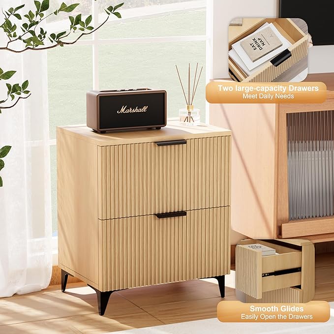 Royal Windsor Small Fluted Nightstand Set of 2 with 2 Drawers, Side End Table, Small Accent Storage Cabinet,Modern Night Stand Bedside Table for Bedroom Full Size Bed,Natural Oak