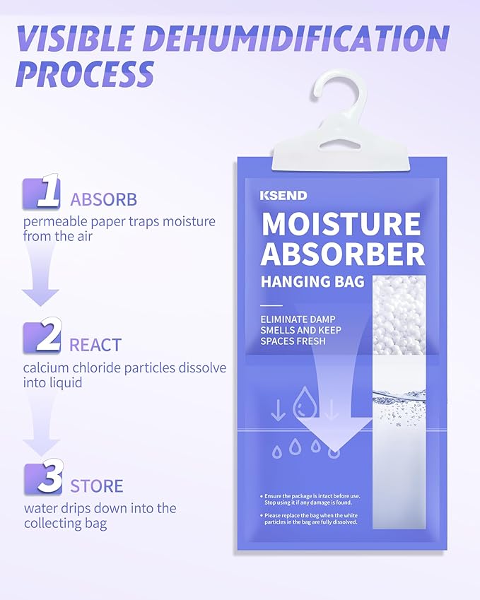 - IDEAL FOR VARIOUS ROOMS: Ksend dehumidifier pack comes in compact packaging, making it easy to carry and store wherever needed. It suits various spaces, including closets, laundry rooms, bathrooms, and kitchens. To effectively control humidity, you can adjust the number of dehumidifier bags used based on the size and humidity of each room.