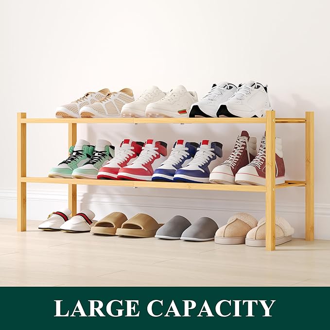 Smiry Shoe Rack, 2 Tier Long Bamboo Shoe Organizer, Stackable Free Standing Wooden Shoe Storage Shelf for Closet, Entryway, Front Door Entrance, Natural