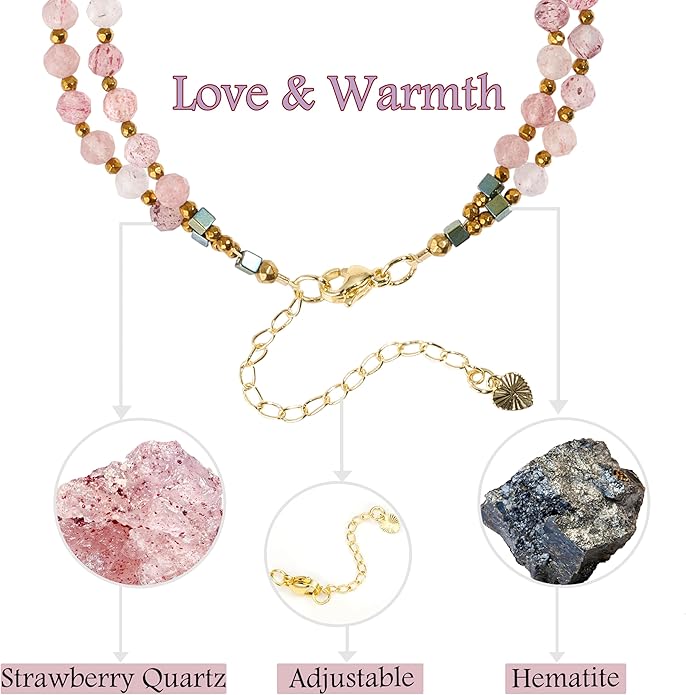 - Chakra Strawberry Quartz Bracelet: Linked to the heart chakra, Strawberry Quartz enhances your compassion and understanding towards others. As you embark on your journey to find love, let Strawberry Quartz be your companion, guiding you toward deeper connections and a more fulfilling emotional life