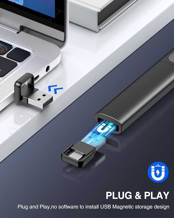 - 【2-IN-1 USB Type C Receiver 】The presenter clicker comes with a unique dual-head design, USB & TYPE-C can meet all your need. You can smoothly switch between different port devices such as Mac, laoptop and pc, one for multiple computers. At the bottom of the slide clicker there is a magnet which can hold your USB dongle securely
