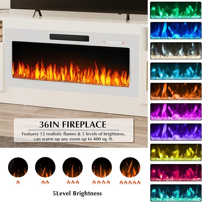 - Fireplace TV Stand with Attractive Flame: The Fireplace TV Stand features a captivating 3D flame effect,can be heated or unheated to create a cozy atmosphere. It comes with a white 36-inch electric fireplace,can heat up to a 400-square-foot room, adjustable between 750 watts and 1,500 watts