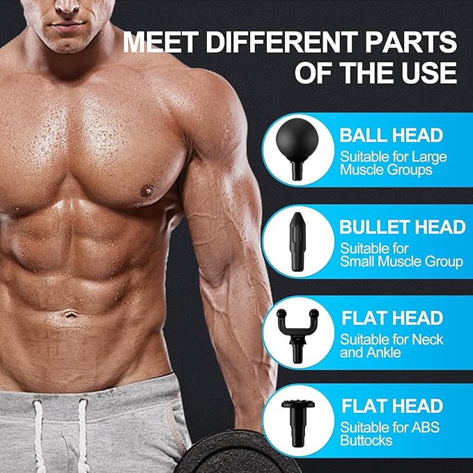 - 【4 massage heads】4 shapes of interchangeable heads can target different muscle groups and can be applied to shoulders, neck, back, legs, soles of feet and other parts. High-strength materials are more resistant to dirt, waterproof and easy to clean. No need to worry about sweating or getting dirty.