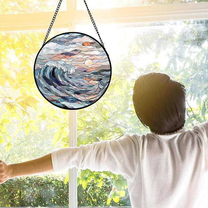 Stained Glass Window Hanging, Sunrise Waves Sun Catchers Diamond Glass Panel Hangings Abstract Suncatcher Decor for Birthday for Women, Men, Wife, Aunt, and Mom 7.8 in