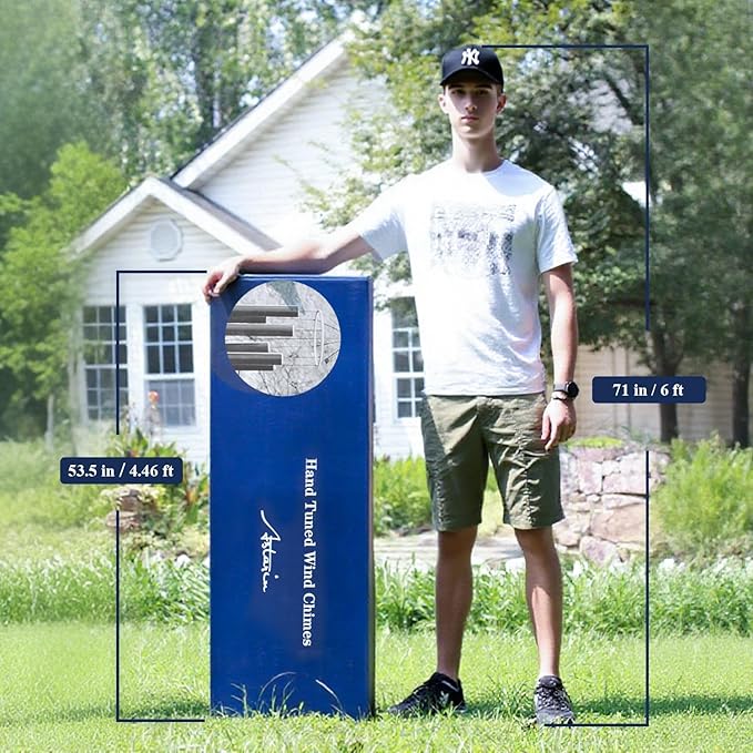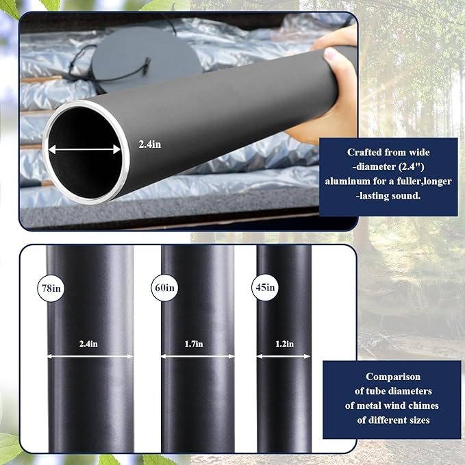 - 78 Inch large Wind Chimes - The longest tube of the large wind chimes is 47.6 Inch,diameter is 2.4 Inch.6 aluminum powder-coated tubes,every metal tube of this large wind chime is hand-tuned by our professional tuning experts to achieve a superior musical performance.Heavy duty nylon cording high density striker for a clear tone and resonances.