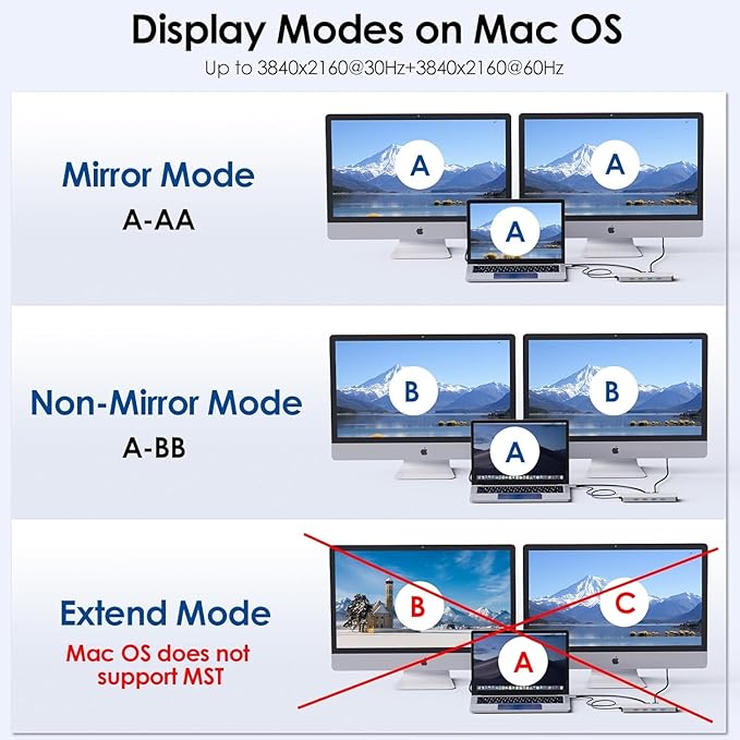 - 8K Ultra HD & Triple Display: Take your visual experience to the next level with our USB C dock. Equipped with dual HDMI and DP ports, it supports up to triple 4K@60Hz video output for Mac users (Under DP1.4). Single 8K@30Hz is only available for Windows PC via the DisplayPort. Ideal for video editors, image designers, game players etc. NOTE: Some Windows laptops only support 3 monitors(including the host screen) due to their graphic card limitations. Mac OS supports extending the display to a single external monitor only