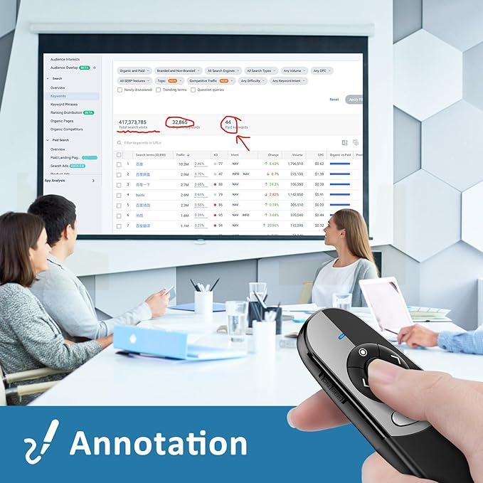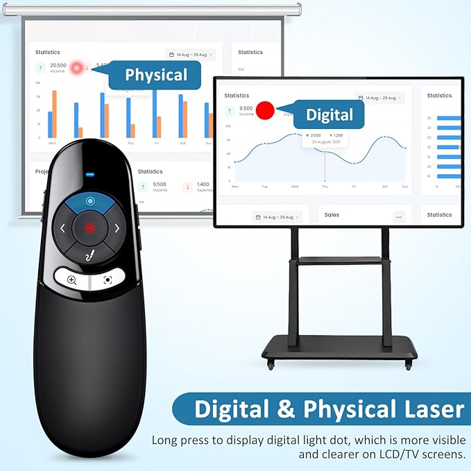 - 【Universal Wireless Pointer for Presentation】Our physical & digital presenter clicker can be used on both projector screen and TV LCD LED screens, solving the drawbacks of the vast majority of usb presentation clickers on the market. And we upgraded various button functions,this wireless presenter remote can clearly present your PPT on the TV screen, equipped with features such as page forward/ backward, full screen/black screen, volume up/down, marking/erasing, digital point, magnifier and highlight to meet your needs, making your PPT presentation smoother and more exciting