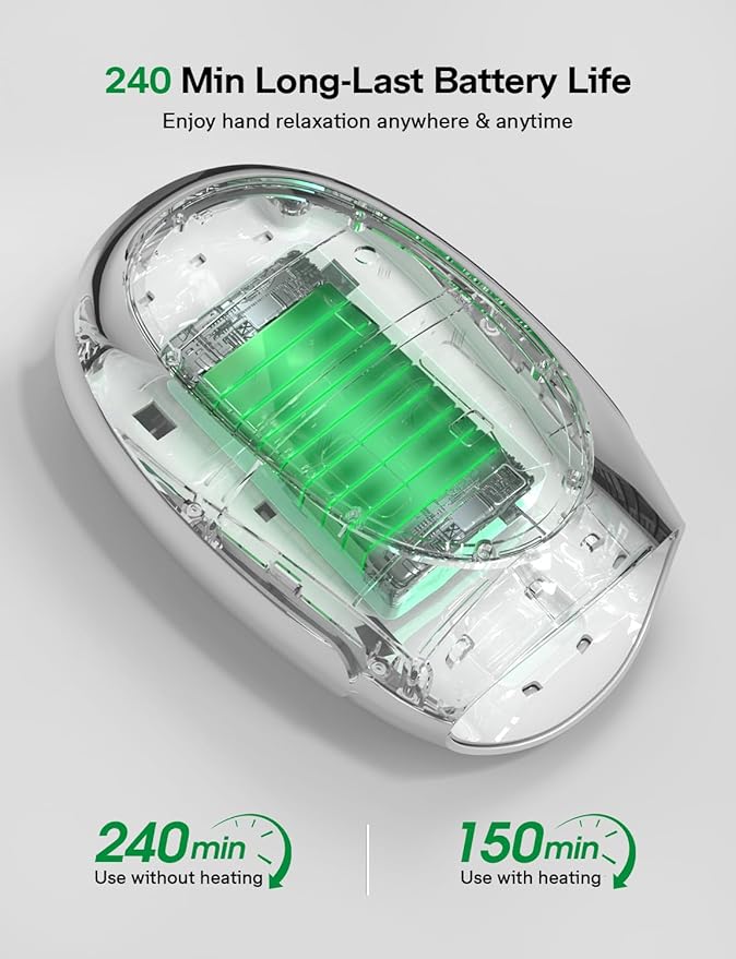 - 【Long-lasting Battery Life & Wireless Convenience】The hand massager with heating and compression features a 2600mAh lithium-ion battery and a Type-C fast charging port. It lasts 120 minutes on a single charge, 200% longer battery life than regular hand massagers, eliminating the need for frequent charging. It's perfect for home, office, or everyday use. It comes with a stylish storage bag for travel. Note: Cannot be used while charging