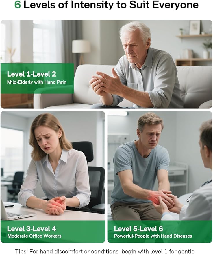 - 【Customized Massage Experience】2-level heat control (113°F/122°F) with NCT intelligent temperature control technology (to prevent overheating), 6 levels of intensity, and 5 timers are available to meet the needs of varying hand sensitivity or chronic pain. Note: People with sensitive hands are advised to start from Level 1. The memory function automatically saves the most recently used settings, allowing for personalized massage with a single click
