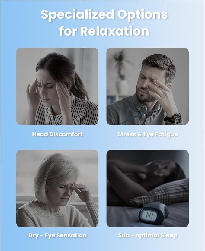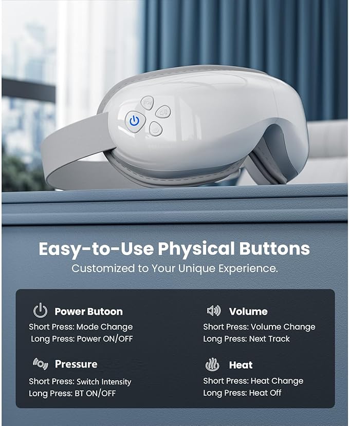 - Quieter Motor & Customizable Music - Our upgraded electric eye care device incorporates low-noise technology reduces audible noise from 60dBA to just 45dBA, so that you can enjoy a low-noise, comfort, warm nap. The built-in white noise music helps to reduce anxiety and can be turned off at your convenience. You can also connect the massager to your phone or tablet to play your own playlist. Simply wear it for 15 minutes before going to bed every night to relax and enjoy a better night's sleep