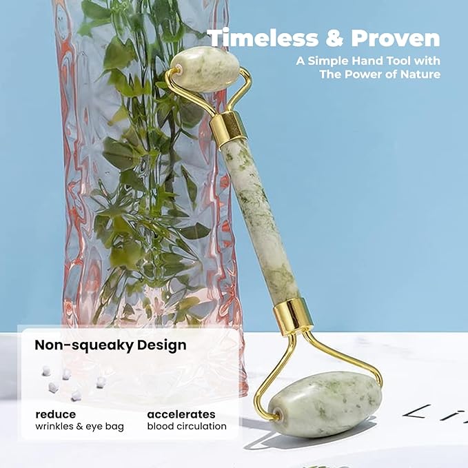 - 2-in-1 Skincare Set – Includes a facial roller for gentle massage and a Gua Sha board for deeper contouring, improving skin elasticity and reducing the appearance of fine lines.