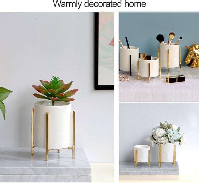 Gold Pencil Cup Sturdy Metal Frame With White Ceramic Pen Holder For Desks and kitchen Appliance Holders