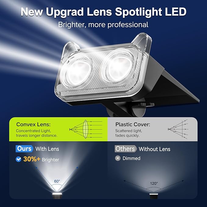 - Brighter Focusing LED & Long Lasting: Equipped with two high-power LED and upgraded optical convex lenses, solar spot lights outdoor provide brighter, more focused light. Solar lights outdoor feature a 1200mAh high-capacity battery for long-lasting performance. In high light mode, solar spotlight offer up to 12 hours of continuous illumination, while low light mode extends this to 20 hours. Whether lighting up your garden or yard, solar outdoor lights ensure reliable, long-term outdoor use