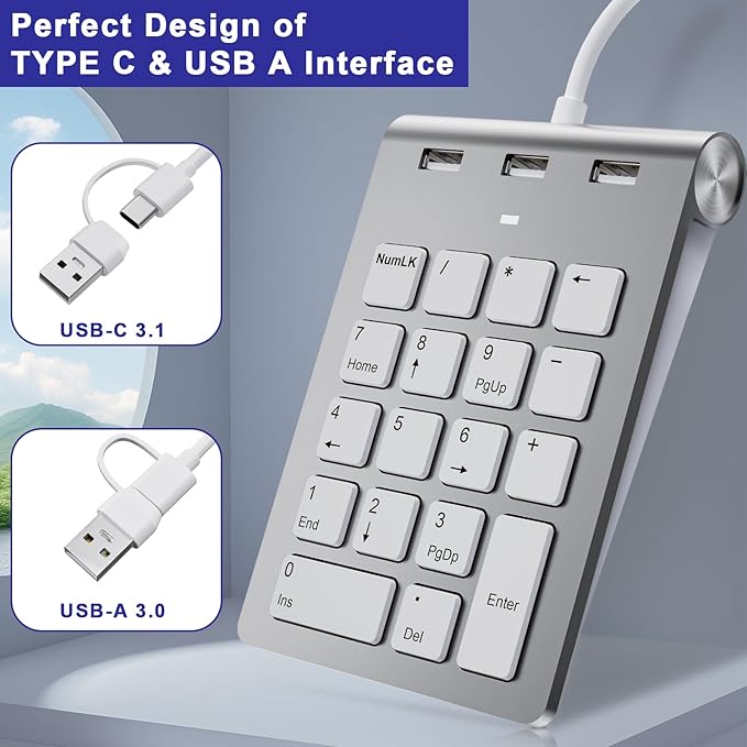 - 【USB C/USB A Dual-Port Design】The numeric keypad is equipped with dual USB A and USB C ports, ensuring seamless connection with various devices. Whether it's a device with a traditional USB interface or a modern Type-C interface, it's easily compatible. It offers you an efficient and convenient input experience and is especially suitable for users of laptops, PCs, and desktops without a built-in numeric keypad, becoming an indispensable assistant on your desk.