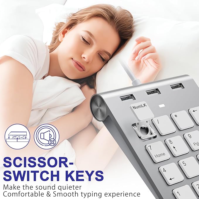 - 【3 USB 2.0 Ports - Expandable Design】In addition to the numeric keypad function, this keyboard is also equipped with 3 additional USB 2.0 ports, allowing you to conveniently connect a mouse, USB flash drive, external hard drive, or other peripherals. This integrated design not only provides efficient multitasking support but also saves desk space, creating a cleaner and more organized work environment and significantly improving your work efficiency.