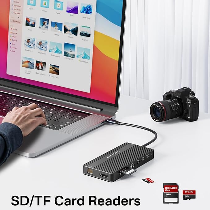 - 【14-In-1 USB C Docking Station 】: ANYOYO USB C Docking Station Dual Monitor could extend your laptop from USB C/thunderbolt 3/4 to a 14-port workstation, with 2*4K HDMI DP Display Ports 3*10Gbps USB C 3.1, 2*10Gbps USB A 3.1, 1xUSB 2.0, SD/TF card reader, 1000Mbps Ethernet,3.5mm audio and microphone, and PD 100W charging,⚠️⚠️⚠️NOTE: Not all USB-C device is compatible with the hub,the incompatible device cannot use the HDMI or DP of this dock. And all external monitor images are the same on Mac OS.due to Mac OS system limit