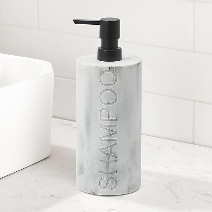 Matte White Shampoo Dispenser Modern Refillable Pump Bottle with Embossed Text, Durable Resin Construction for Bathroom and Kitchen