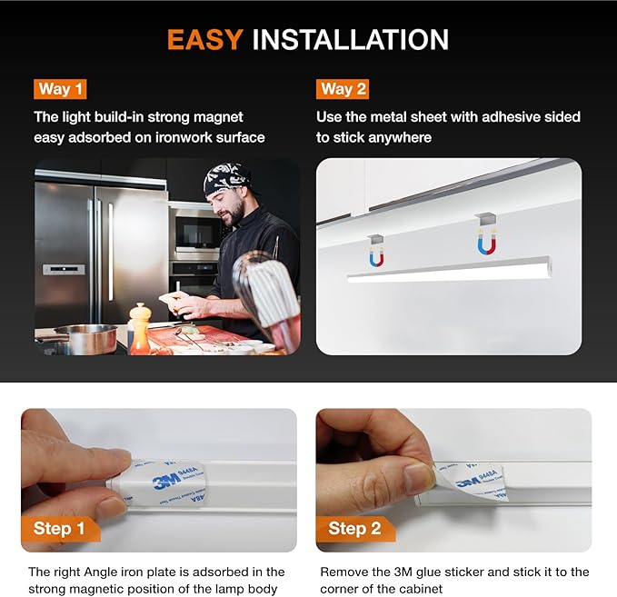 - 👍【Easy to Install, Wide Application】kitchen lights under cabinet has built-in magnetism and can be easily stuck on any iron surface, no electrician required. It also comes with a 3M adhesive right-angle metal plate, ensuring it sticks to any non-ferrous surface. Magnetic design allows LED strips to be easily removed for charging or changing positions, perfect for kitchens, bedrooms, picture, camping,closets, nurseries, counters, garages, basements, stairs, hallways, gift display cases, bedside