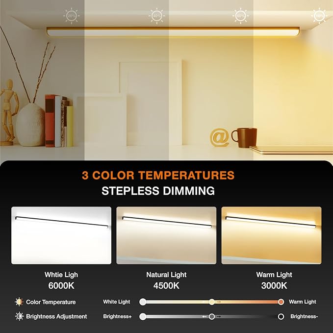 - 👍[Upgraded dimmable and color-adjustable closet light]: The under-cabinet light provides three different color temperatures ((3000K / 4500K / 6000K), which can be switched through the light switch or remote control. It uses 68 energy-saving LED lights and no glare With a frosted cover, the display index of the cabinet light reaches 90, the light is even and does not hurt the eyes. In addition, unlike the fixed brightness of other products, our indoor sensor lights can be infinitely dimme