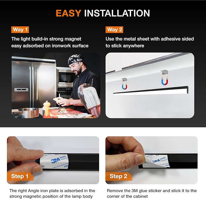 - 👍【Easy to Install, Wide Application】kitchen lights under cabinet has built-in magnetism and can be easily stuck on any iron surface, no electrician required. It also comes with a 3M adhesive right-angle metal plate, ensuring it sticks to any non-ferrous surface. Magnetic design allows LED strips to be easily removed for charging or changing positions, perfect for kitchens, bedrooms, picture, camping,closets, nurseries, counters, garages, basements, stairs, hallways, gift display cases, bedside