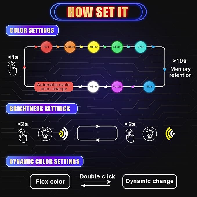 - Nice brightness setting: if you like stable color in fixed brightness, long click the button for 2s to switch the light dimmer or brighter
