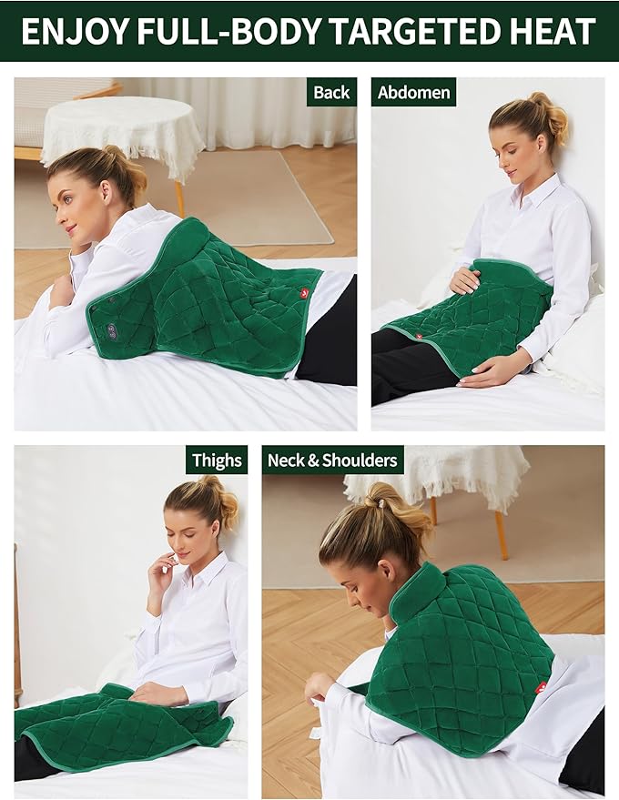 - Coverage 4 Heating Zones: Electric heating pad is in a large size:16'' x 22'', and 4 heated zones that cover the neck, left and right shoulders, and upper spine; The heating pad can be used on various body parts, including the legs, shoulders, back, waist, and belly