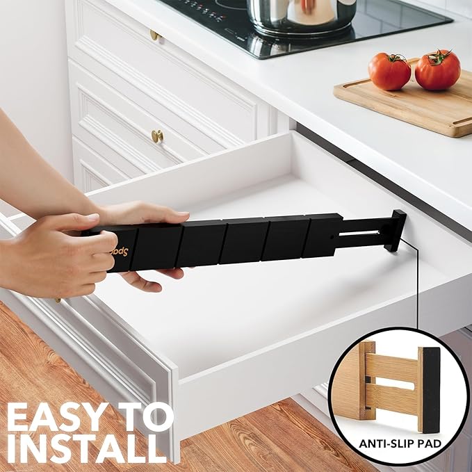 - Drawer Dividers That Stay in Place: Strong spring-loaded design makes them sturdy dividers, with non-slip rubber pads in the end, keeping it stay put all the time and protect your drawers from scratches