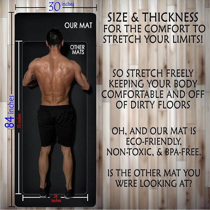 - Our extra large yoga mat thick wide design offers superior comfort and support that makes for the perfect stretching mat.