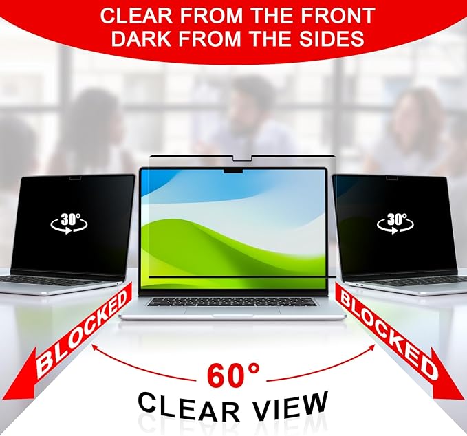 - 3.【Superior Privacy Protection】- MacBook Air 13 privacy screen, limits viewing angle to +/- 30 degrees, data is visible only to persons directly in front of the monitor while prying eyes beside you see only nothing. privacy screen Macbook Air 13.6 inch, to protect your sensitive information, your passwords, personal content, etc., Prevent information from being leaked.