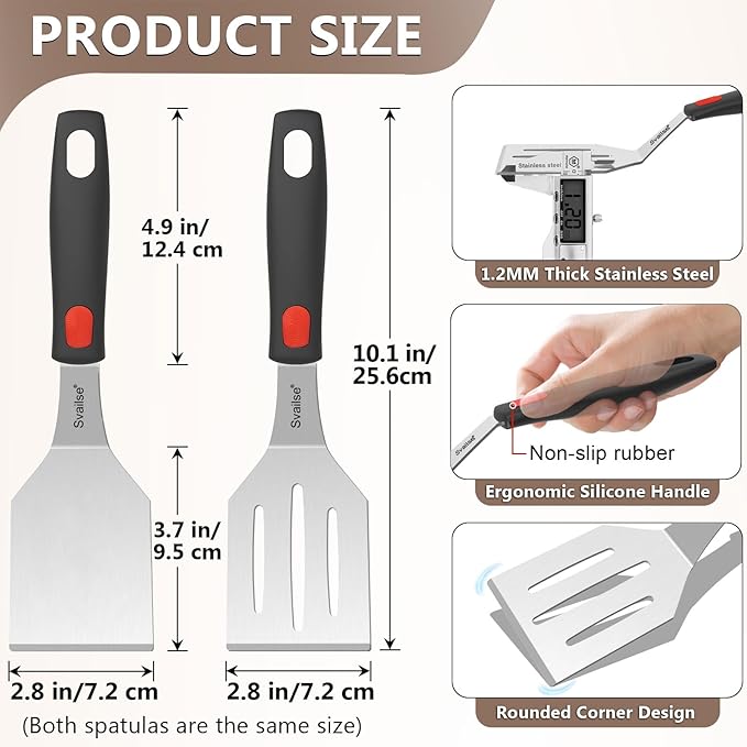 - Reliable Metal Spatula Set: The set contains 1 slotted spatula and 1 solid spatula, 10.1 x 2.8 inches. Made of 1.2mm thickened stainless steel material, it is sturdy and not easy to deform. It can easily cope with various grilling and baking tasks