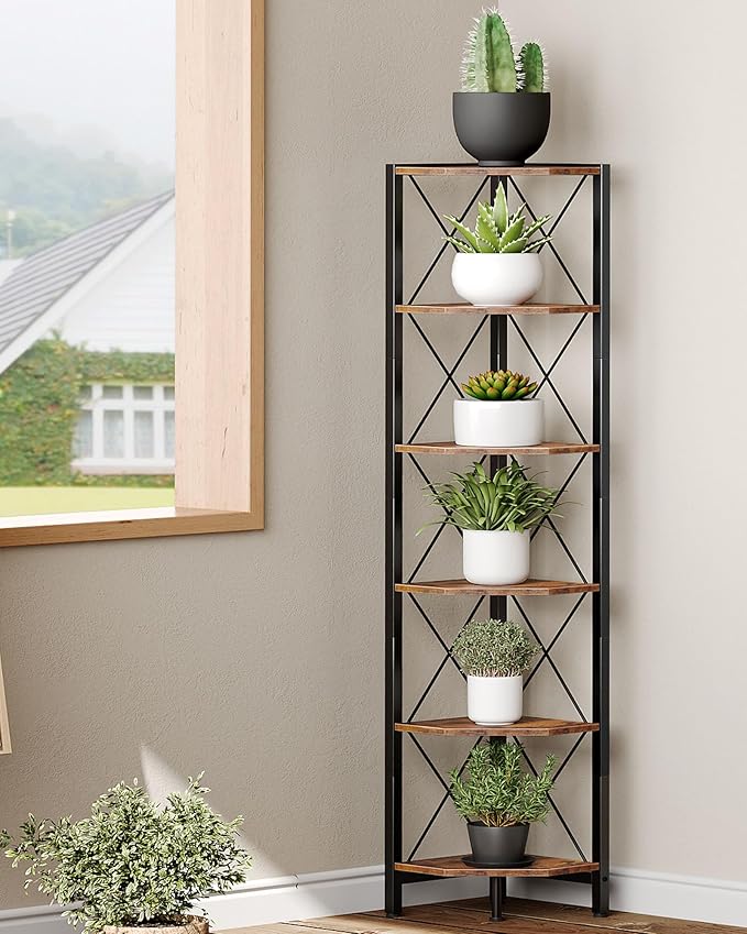 6-Tier Corner Shelf, Corner Bookcase, 66.9" Tall Vertical Display Rack, Plant Stand, Open Storage Shelf, for Living Room, Bedroom, Study, Kitchen, Rustic Brown and Black TCJ13BF