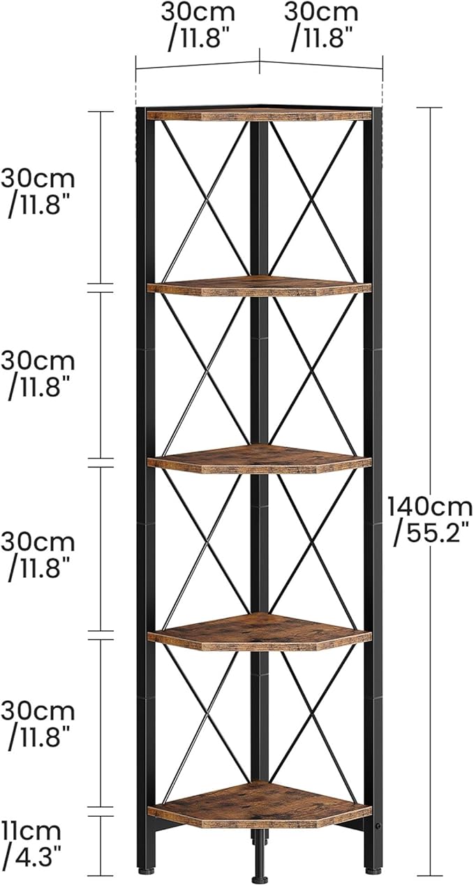 5-Tier Corner Shelf, Corner Bookcase, 55.2" Tall Vertical Display Rack, Plant Stand, Open Storage Shelf, for Living Room, Bedroom, Study, Kitchen, Rustic Brown and Black TCJ12BF