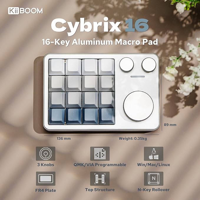 - 【Customize Your Workflow with 16 Keys + 3 Knobs】 The KiiBOOM Cybrix 16 macro pad has 16 fully programmable keys and 3 rotary knobs, allowing you to create a personalized workflow that fits your needs. Whether you're working on a creative design project or managing multiple tasks, assign macros, shortcuts, or commands to the keys for seamless multitasking across your software, enhances your efficiency during video editing, graphic design, or music production. The keyboard also features 5 layers of functionality, enabling you to expand your customization options even further.