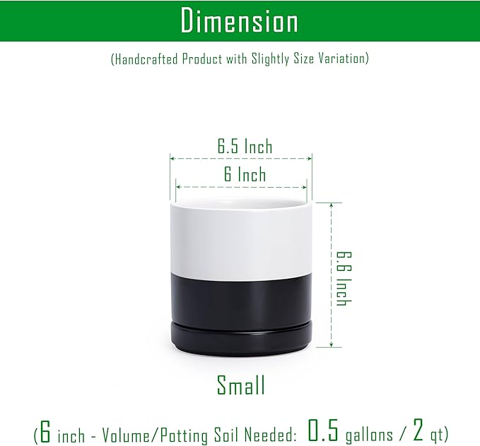 - Multiple Size Options: Available in six sizes (3.5" to 11.8") to fit plants of all types, from small succulents to larger houseplants. Small 6 Inch Planter Pot: 6.5" Diameter x 6.6" H, Potting Soil Needed: 0.5 gallons / 2 qt.