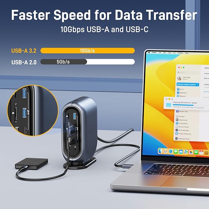 - 10Gbps Fast Data Transfer Across Devices: With 3x USB 3.2 and 2x USB 2.0 ports, this DisplayLink docking station for Mac supports data transfer speeds up to 10Gbps, perfect for moving files quickly. You can connect multiple devices, like smartphones, hard drives, or printers, without the hassle of plugging and unplugging. Whether you're using a MacBook multi monitor dock or a Thunderbolt 5 dock, enjoy seamless file sharing across devices. It’s the ultimate docking station triple monitor for professional work or home office use.