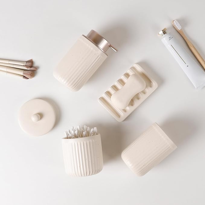 - Space-Saving Design: This bathroom set accessories each piece in the set is thoughtfully designed to optimize your bathroom countertop space, keeping it neat and organized. Handy & easy-to-use around the house.
