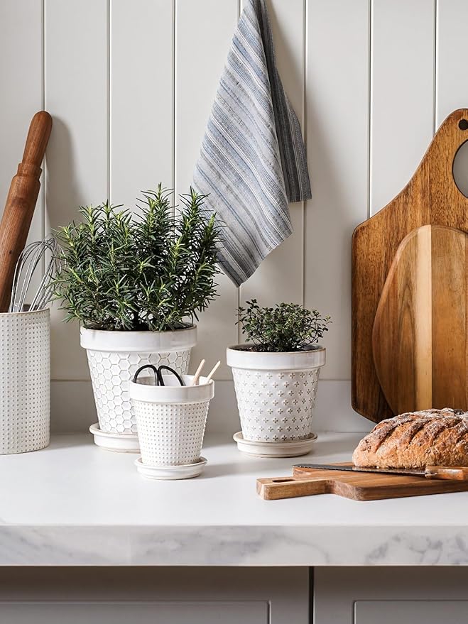 - Decor Living Space: Discover a cute embossed design ceramic pots –4.9 inches in diameter and 3.9 inches top opening, good for small and medium sized plants and flowers such as succulents, African violet, vanilla, basil, etc. These ceramic flower pots add a touch of green to tables, windowsills, balconies, or bookshelves. The delicate balance of embossed design and botanical vitality converges, creating an atmosphere of unparalleled grace and visual delight