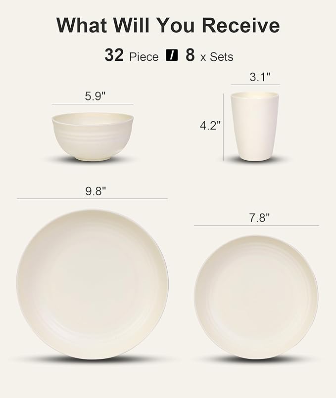 Quatish 32 Piece Plates and Bowls Sets for 8, Unbreakable Dinnerware Sets, Plastic Dish Set for Camping, Dishwasher Microwave Safe, Outdoor Kitchen and Apartment Dinning RV Essentials, Beige