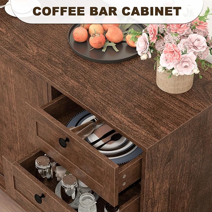 - [Special Features] This kitchen pantry cabinet comes loaded with features! There are 2 large drawers, 1 open shelf and the side door has adjustable storage shelf inside, allowing you to customize your storage based on your needs. It serves beautifully as both a buffet sideboard and a coffee bar cabinet. Plus, it makes a lovely addition to your dining room for storing dinnerware.
