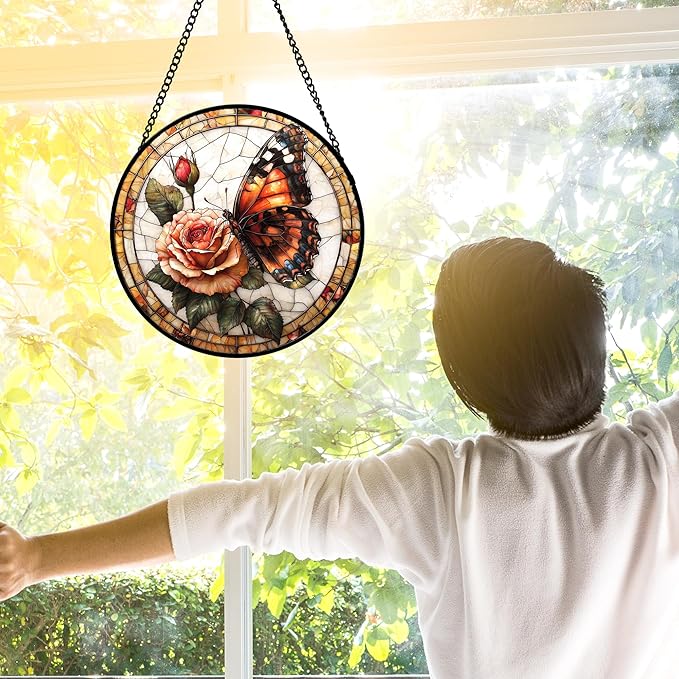 Stained Glass Window Hanging, Butterfly Picking Flowers Suncatcher for Doors Home Sun Catchers Decoration and Christmas, Mother's Day Birthday Gifts for Women, Men, and Mom 7.8 in