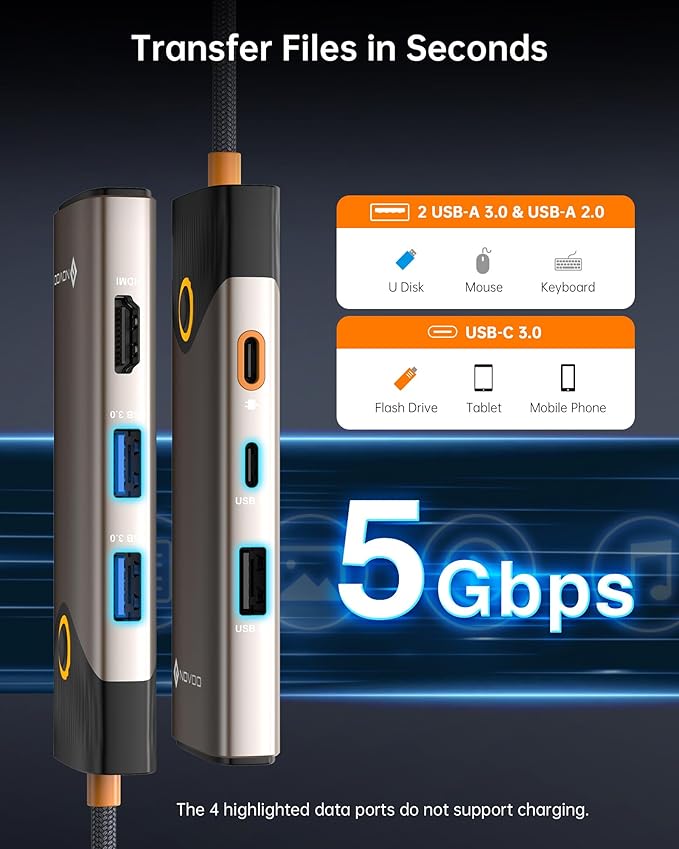 - ใ๐๐ฎ๐ฉ๐๐ซ-๐ ๐๐ฌ๐ญ ๐๐๐ญ๐ ๐๐ซ๐๐ง๐ฌ๐๐๐ซ ใThe NOVOO USB C hub offers transfer speeds up to 5Gbps, ensuring quick file syncing and smooth multimedia transfers. Its reliable performance supports peripherals like keyboards and mice, providing a seamless, efficient experience for your devices.