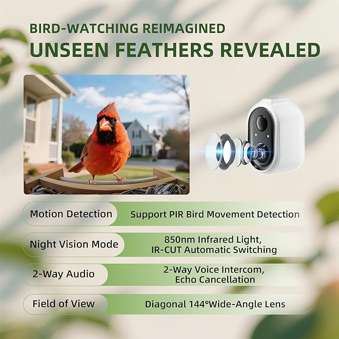 - SOLAR-POWERED, ZERO MAINTENANCE: The smart bird feeder with camera runs on a 3W solar panel + 5200mAh battery – no wires, no ladder climbs. Rainproof design (IP65) ensures year-round birdwatching, perfect for seniors who want effortless nature access.
