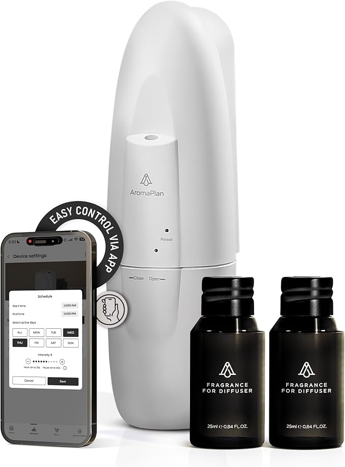 - EASY TO SET UP WITH CUSTOMIZABLE SETTINGS – This new scent diffuser is compatible with Bluetooth technology (Bluetooth is a registered trademark of Bluetooth SIG) and is controlled through the AromaPlan App, available for iOS and Android. It is possible to create multiple advanced schedules (days of operation, specific times, fog intensity, work time, and break time).