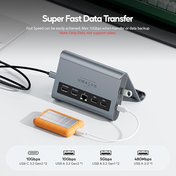 - 【Super Speed Data Transfer Dock】: This surface docking station has 2 USB C 10Gbps port (not support video and charging) , 1 *USB A 10Gbps 5Gbps and 2 *USB A 5Gbps to transfer files. The USB A 2.0 Port allows you to connect mouse/keyboard without lag. It improves your work efficiency. With PD 100W Charge Port and RJ45 Wired Gigabit Ethernet (10/100/1000Mbps).