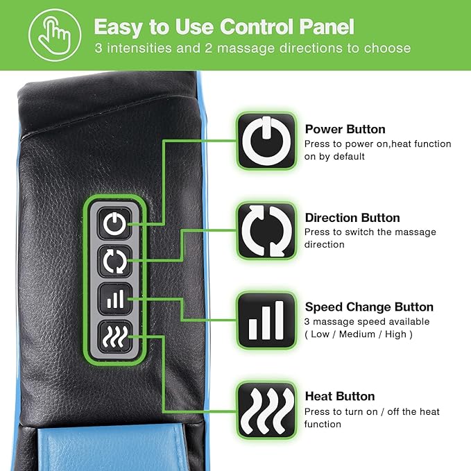 - 【Simple and easy to use premium massager】Simply plug it in and press start. The two-way kneading nodes provide ultimate comfort and a pleasant massage experience. There is also an optional heating feature. This massager for neck and back is crafted from durable, high-quality materials. The mesh dust-resistant cloth prevents accumulation of dust, and the high-grade PU leather allows for easy cleaning with a simple wipe.