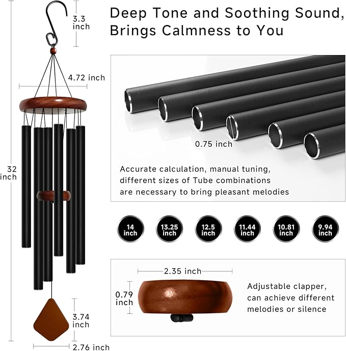 - Deep Tone Wind Chimes for Outside: This wind chime has a total length of 32 inches and uses a 6-length combination of 14/13.2/12.5/11.4/10.8/9.9. The scale is manually adjusted to F major, creating a relaxing and enjoyable melody. The diameter of the tube is 0.75 inches, making the sound more persistent and long-lasting. The wall thickness of the tube is 0.06 inches, and the sound is neither hollow nor sharp. When a gentle breeze blows by, wind chimes will play a relaxing music for you.