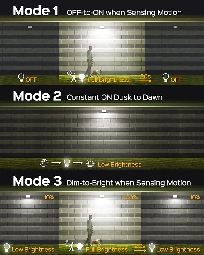 - 【3 Lighting Modes with Motion Sensing】 - Enhanced by a 120° motion sensor detecting movement within 23 feet, our Outdoor Flood Light offers 3 lighting modes: Mode 1: OFF-to-ON motion sensor security lighting, activates when motion is detected. Mode 2: Dusk-to-Dawn lighting with 10% brightness—all night illumination for yards, gardens, patios. Mode 3: Dim-to-Bright when sensing motion—energy-saving all night lighting option for porches, parking lots, etc.