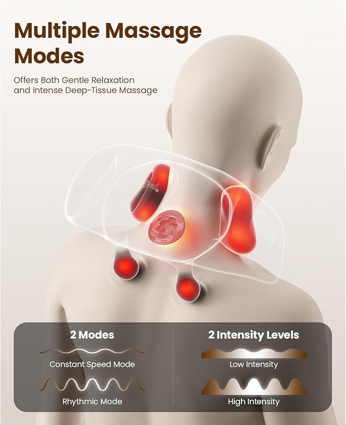 - Hands-Free/Handheld & Library-Quiet Operation: The upgraded neck massager features 2 wearable methods: adjustable shoulder straps for hands-free therapy during work, gaming, or chores, and handheld grips for real-time pressure control to customize intensity. Our ultra-quiet 45dB design (quieter than office whispers) pairs a brushless motor with acoustic engineering to deliver discreet relief anywhere: Melt tension at work, unwind at night, recharge in libraries, or meditate in quiet zones.